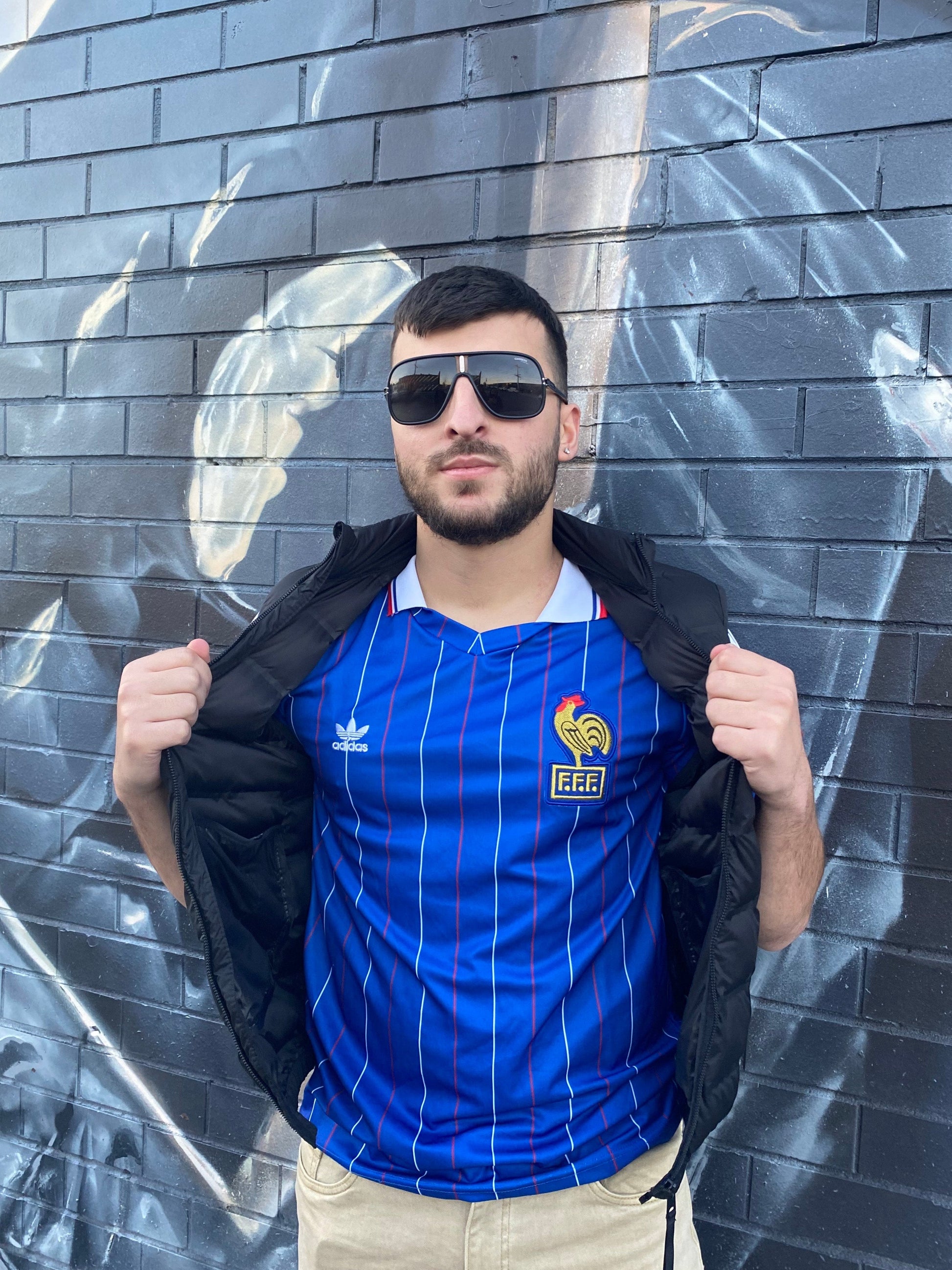 A piece of poetic tragedy. Royal blue, striped collar, and white cuffs, the 1982 home kit brings back memories of Platini’s brilliance and that unforgettable semi-final. Football as drama, stitched in cotton.