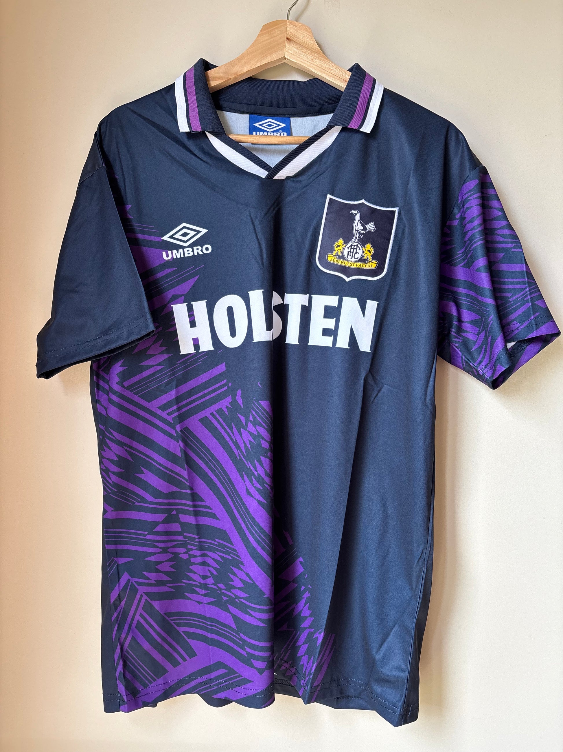 Step back into Spurs history with the Tottenham Hotspur Retro 94/95 Away Kit. This fan edition recreates the iconic bold purple and navy design, one of the club’s most memorable looks of the ’90s. Featuring the classic Umbro-inspired geometric pattern, vintage collar, and stitched Spurs crest, it captures the authentic style worn by legends of the era.